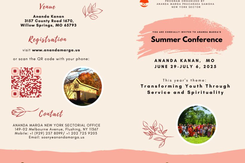 Join us for the Ananda Marga Summer Conference 2025, June 29–July 6 at Ananda Kanan Retreat Center, Missouri. Enjoy a week of meditation, Kiirtan, philosophy classes, workshops, and joyful community living, with special programs for children and youth. This year’s theme is “Transforming Youth Through Service and Spirituality.” All are welcome!