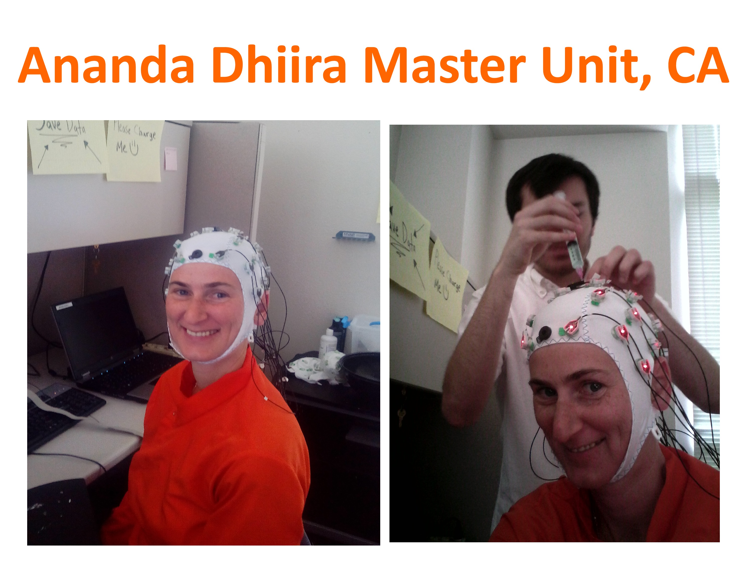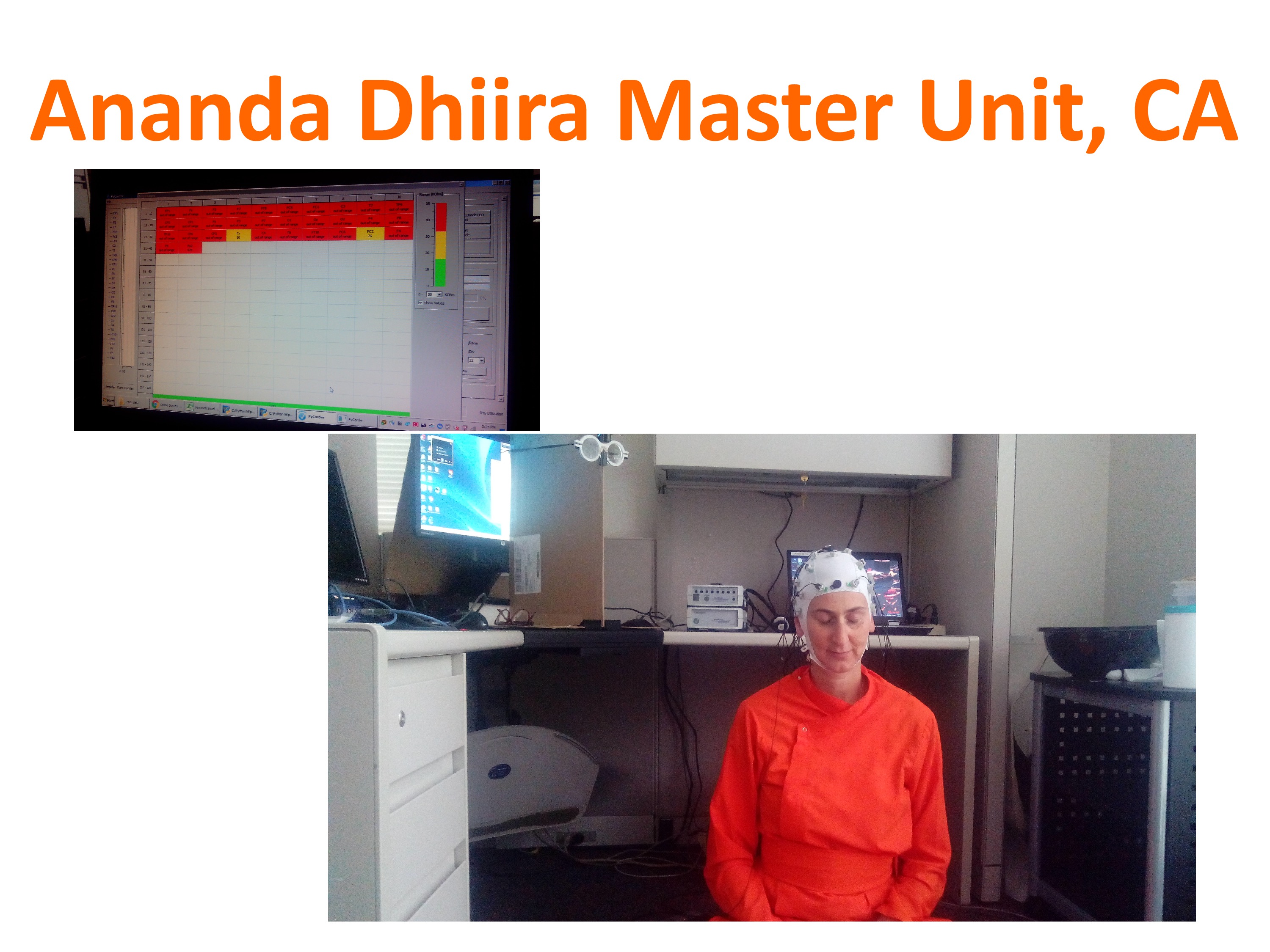At the same time, a margii brother (Sucharit) invited me to test my brain waves while meditating for a study conducted at UC Davis (University of California Davis) in Sacramento. Sucharit is conducting various experiments to analyze the different responses that the brain has during meditation (Iishvara pranidhana, Dhyana, etc), and during other stimulating exercises as well as guided meditation and relaxation. The study had 2 groups of participants: one group had experienced meditators and the other had complete beginners. I was very interested in taking part in this kind of study and help him in his research.