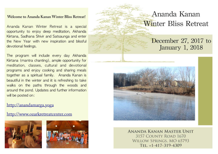 Ananda Kanan Winter Retreat is a special opportunity to enjoy deep meditation, Akhanda Kiirtana, Sadhana Shivir and Satsaunga and enter the New Year with new inspiration and blissful devotional feelings.The program will include every day Akhanda Kiirtana (mantra chanting), ample opportunity for meditation, classes, cultural and devotional programs and enjoy cooking and sharing meals together as a spiritual family. Ananda Kanan is beautiful in the winter and iit is refreshing to take walks on the paths through the woods and around the pond.