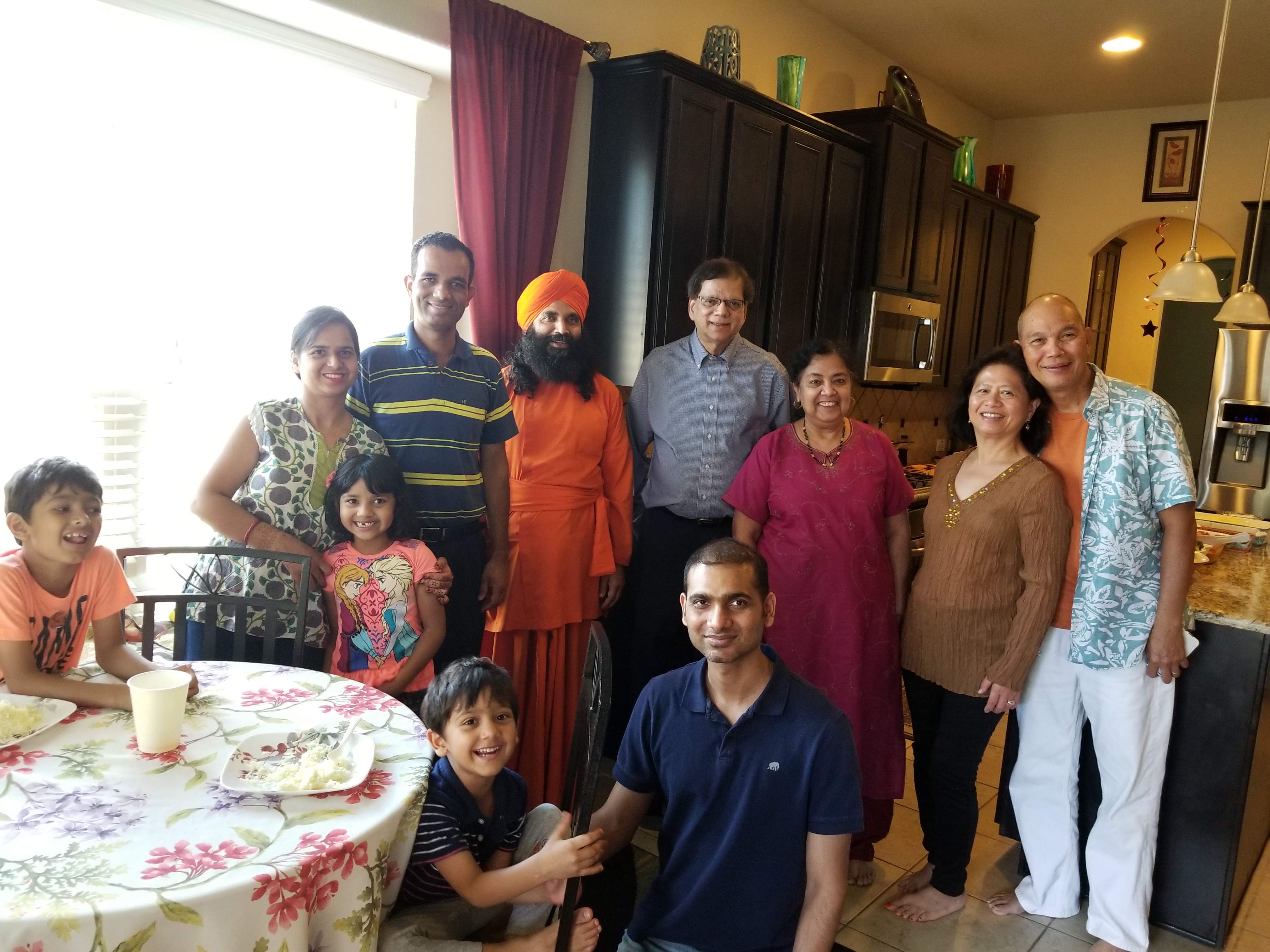 Prabhat Samgiita celebration in Houston in the house of Mayank and Smita Lal. In the picture below right Dada Anudhyanananda teaches meditation...