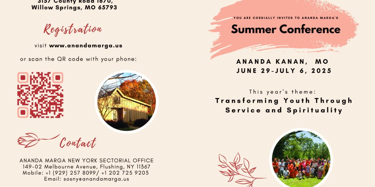 Join us for the Ananda Marga Summer Conference 2025, June 29–July 6 at Ananda Kanan Retreat Center, Missouri. Enjoy a week of meditation, Kiirtan, philosophy classes, workshops, and joyful community living, with special programs for children and youth. This year’s theme is “Transforming Youth Through Service and Spirituality.” All are welcome!