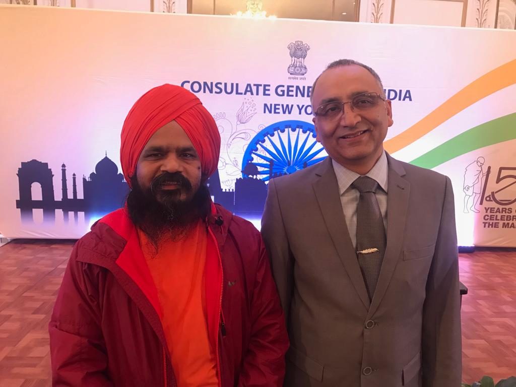 Sandeep Grover, Consul of Administration in the Consulate General of India in New York with Acarya Abhiramananda Avadhuta, Sectorial Secretary of Ananda Marga in New York Sector.