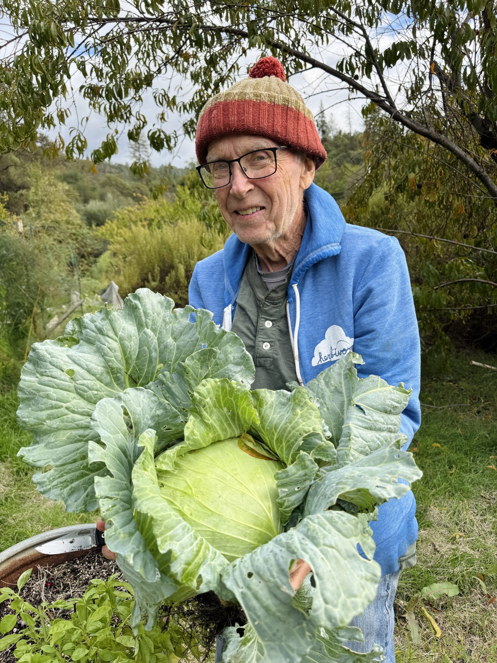 A volunteer holding a giant cabbage at Ananda Dhiira
