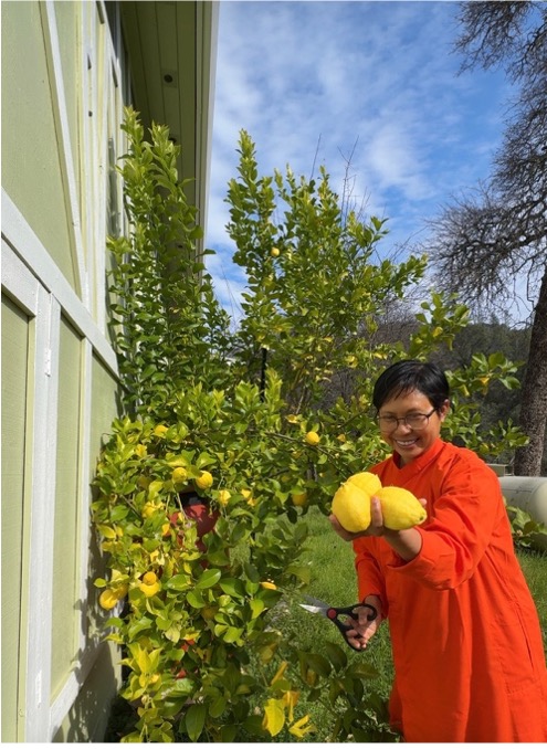 This year brought a joyful milestone at Ananda Dhiira Master Unit in Penn Valley, California, with the first harvest of fresh organic lemons from the property. After many years of caring for the trees, the community was delighted to finally gather these large and beautiful fruits. The harvest was a sweet reminder of the patience, care, and harmony with nature that continues to grow at Ananda Dhiira.